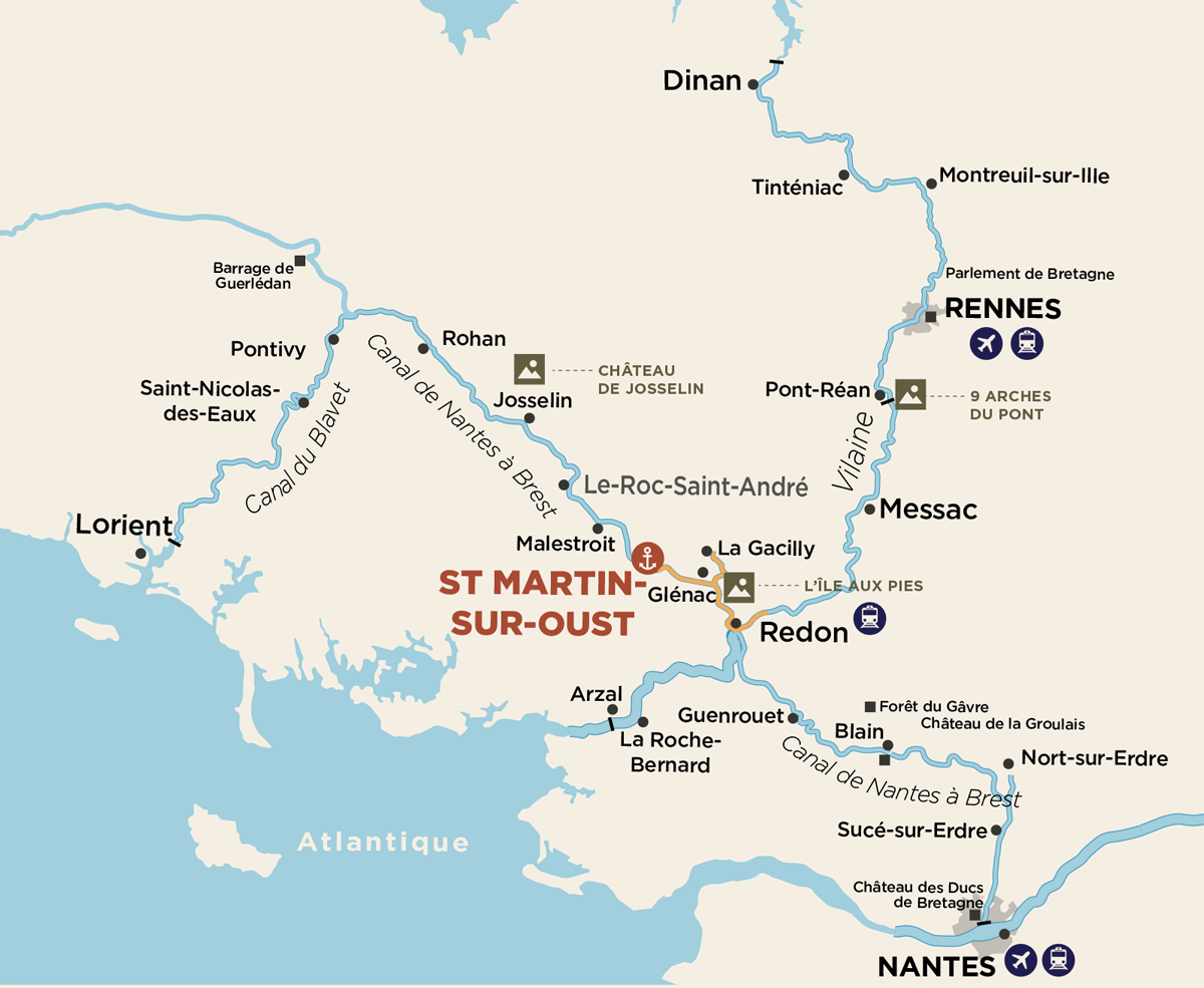 Un départ de la base de Saint-Martin-sur-Oust offre de nombreuses possibilités de navigation fluviale. Sur le Canal de Nantes à Brest vers l’est, rejoignez le très beau site de l’île aux Pies. De là, optez pour un détour sur la petite rivière de l’Aff vers le joli village de la Gacilly avec ses ruelles fleuries et son magnifique jardin botanique. En poursuivant sur le canal de Nantes à Brest, vous atteignez Redon et son abbatiale Saint Sauveur, véritable carrefour de voies d’eau et pays de Merlin l’Enchanteur ! Vers Nantes empruntez la vallée de l’Erdre en passant par Blain et la forêt du Gâvre. À l’ouest de Saint-Martin-sur-Oust, sur le canal de Nantes à Brest s’ouvre l’un des plus beaux parcours de navigation. Après Malestroit et ses maisons à colombages, des chemins de mousse, des villages de granit et d’ardoises, vous voici soudain surpris par les murailles et les donjons impressionnants du château de Josselin. La magie opère !