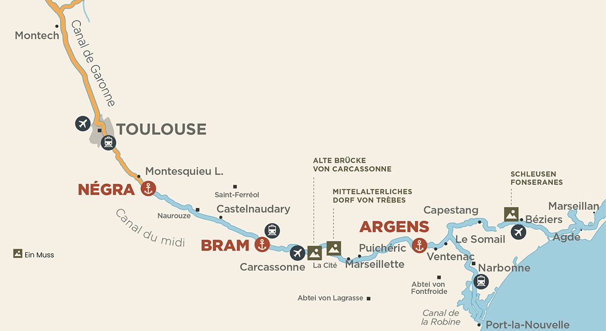 Zwischen Castelnaudary und Toulouse eröffnet der Canal du Midi ab Négra eine Reise durch drei Jahrhunderte. Gen Westen führt die Tour unter hundertjährigen Platanen bis Toulouse. Die von der Garonne durchzogene, rosafarbene Stadt besitzt ein einzigartiges Kulturerbe, für das die romanische Basilika Saint-Sernin exemplarisch ist. Ursprünglich im Jahr 250 errichtet, um die Reliquien des heiligen Saturnin zu beherbergen, wurde sie zu einem der wichtigsten Pilgerzentren im Okzident des Mittelalters. Heute ist sie die größte erhaltene romanische Kirche Europas. Östlich von Négra liegt das zum UNESCO- Welterbe gehörende Carcassonne. Umgeben von einer doppelten Wehrmauer mit 52 Türmen und grandiosen Rundblicken, überragt die größte mittelalterliche Festung Europas die Unterstadt.