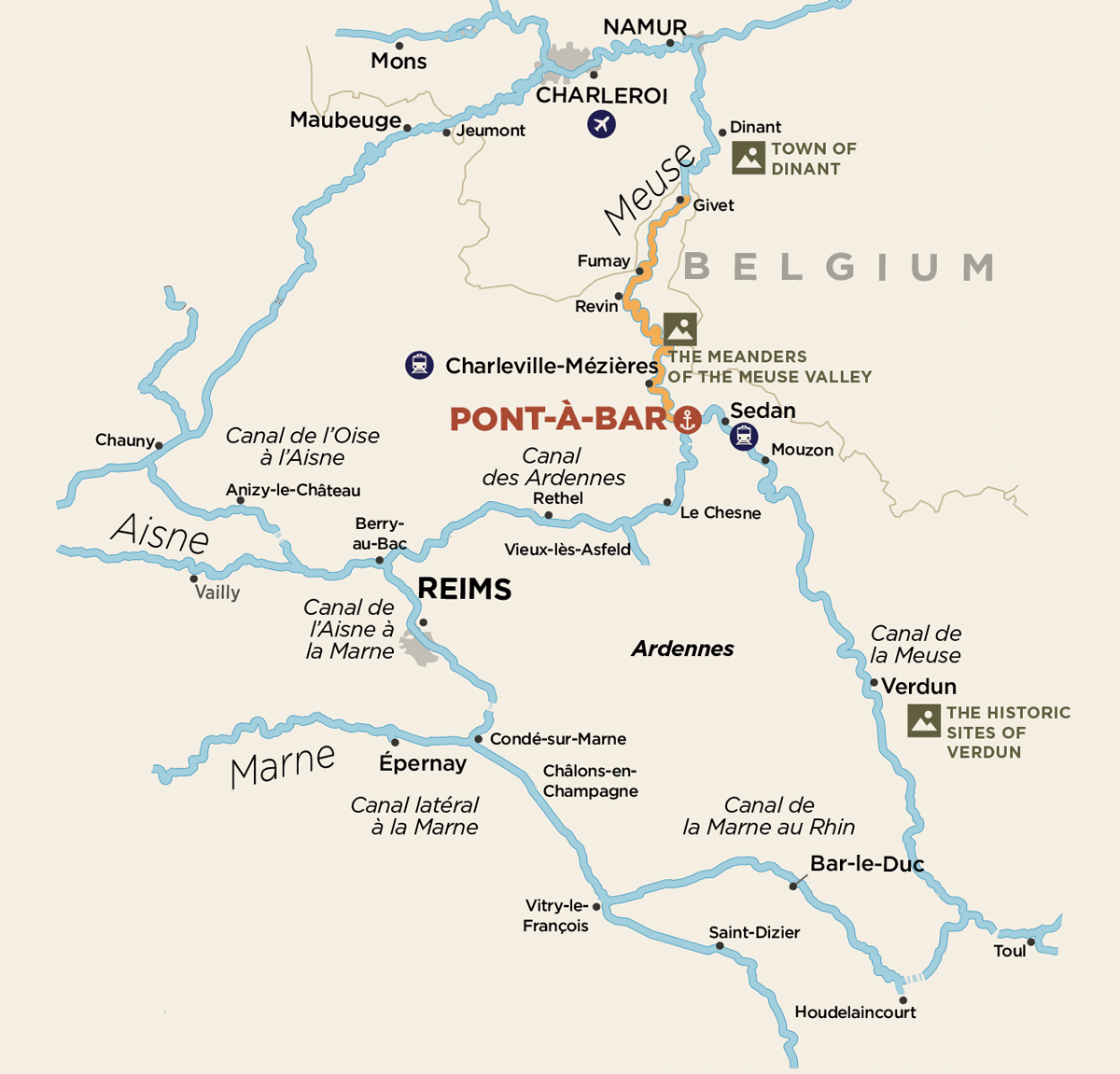 Con nuestro socio Ardennes Nautisme, desde nuestra base en Pont à Bar, diríjase al norte para cruzar la frontera belga o diríjase al canal del Mosa para descubrir Verdún.