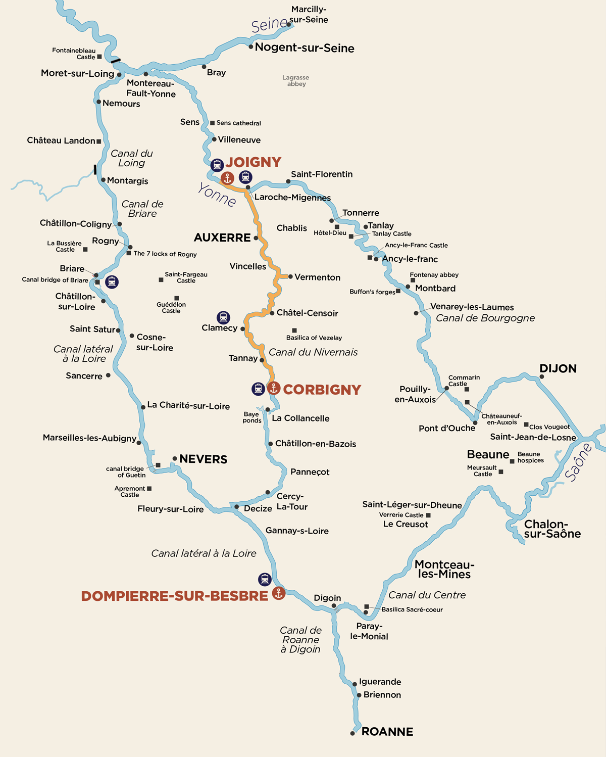 Desde nuestra base en Corbigny, situada en el Canal du Nivernais, diríjase al Canal Latéral à la Loire para disfrutar de un relajante crucero lejos de todo. A la inversa, también puede subir por el Canal du Nivernais hacia Auxerre para sumergirse en la historia de Borgoña.