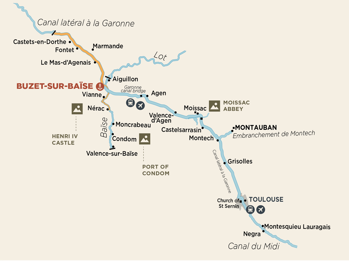 Desde nuestra base en Buzet-sur-Baïse, puede viajar por el Canal Latéral à la Garonne o navegar por el Baïse pasando por Nérac y Condom.