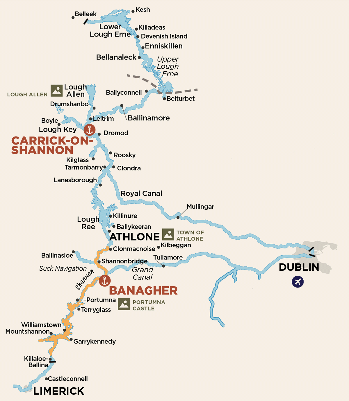 Itinerario BanagherClonmacnoiseAthloneLanesboroughDromodLough Key Forest ParkCarrick-on-ShannonTarmonbarryAthloneShannonbridgePortumnaDromineerTerryglassBanagher